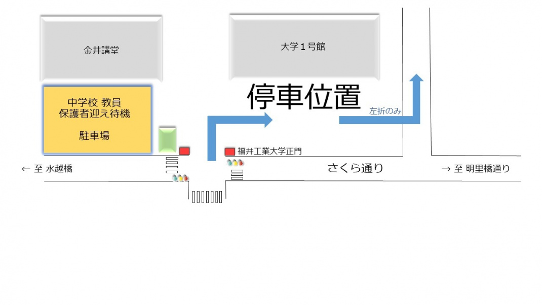 (6)会場内に保護者の待機場所はございません。送迎のみでお願いします。受験生の乗降のための入構は、大学正門さくら通りからお願いします。送迎による学校周辺道路の混雑が予想されますので、時間に余裕をもってお越しください。
