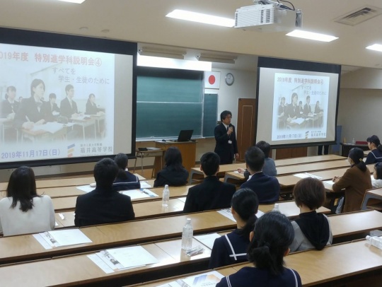 お知らせ news TOP お知らせ 2019年 特別進学科説明会の様子 お知らせ 2019.11.17 2019年 特別進学科説明会の様子 11月17日(日)に特別進学科説明会④を実施しました。説明会では、佐々木副校長の挨拶後、本校教員より特別進学科の教育内容を説明させていただきました。また、ハワイで行われた、SGLI(国際的リーダー養成プログラム)へ参加した生徒による、英語での学校紹介や現地での取り組みもご紹介させていただきました。 授業見学や、サテライト体験、体育館、武徳殿、学食などの施設見学も行い、授業見学では、スーパー特進生徒による進路探究活動や理科実験活動の様子をご覧いただきました。