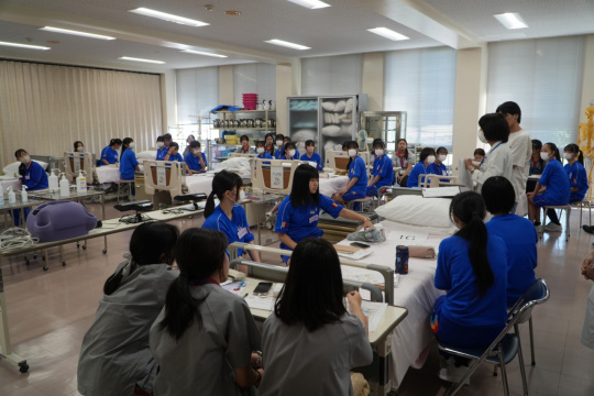 両校で看護学を履修している生徒間で、患者の環境整備や手指衛生体験、術後の看護体験など専門的な内容の実習を通して、探究的な学びを行いました。衛生看護科生徒・学生と英語でコミュニケーションを取りながら、グループ討議などを行いました。