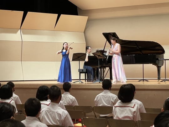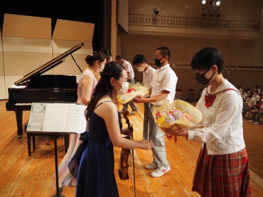 クラリネット、ピアノ、ヴァイオリン、ソプラノの息の合った演奏に生徒たちは魅了されていました。また、ソプラノの東さんの歌声はマイクを使わず 金井講堂いっぱいに響き渡るほど迫力がありました。