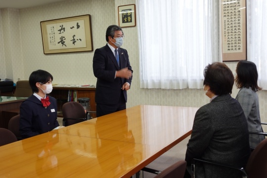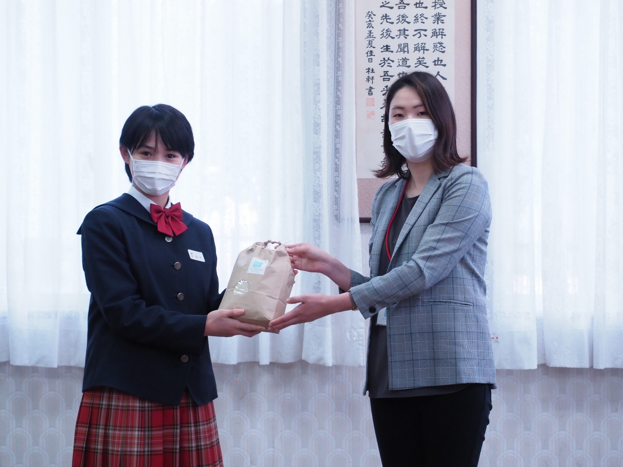 生徒会長の田中愛子さんが生徒代表として贈呈式に臨み、杉本様から励ましの言葉とともにお米を手渡していただきました。