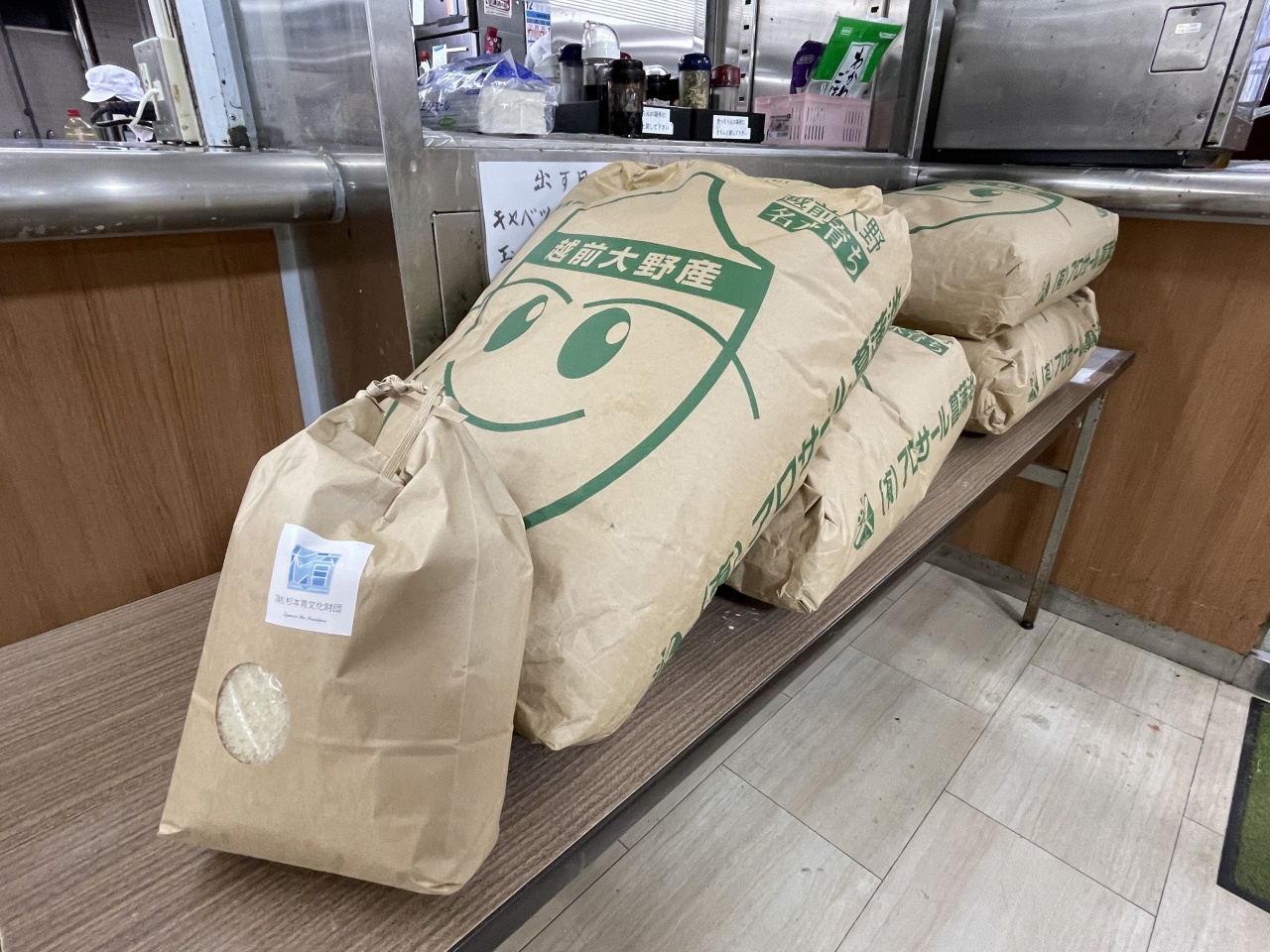 一般財団法人杉本育文化財団は、地元である福井県の振興を目的として活動をしている団体で、生活支援活動をされています。今回は未来を担う生徒たちへの支援として、福井県大野産の新米240kgを提供いただきました。