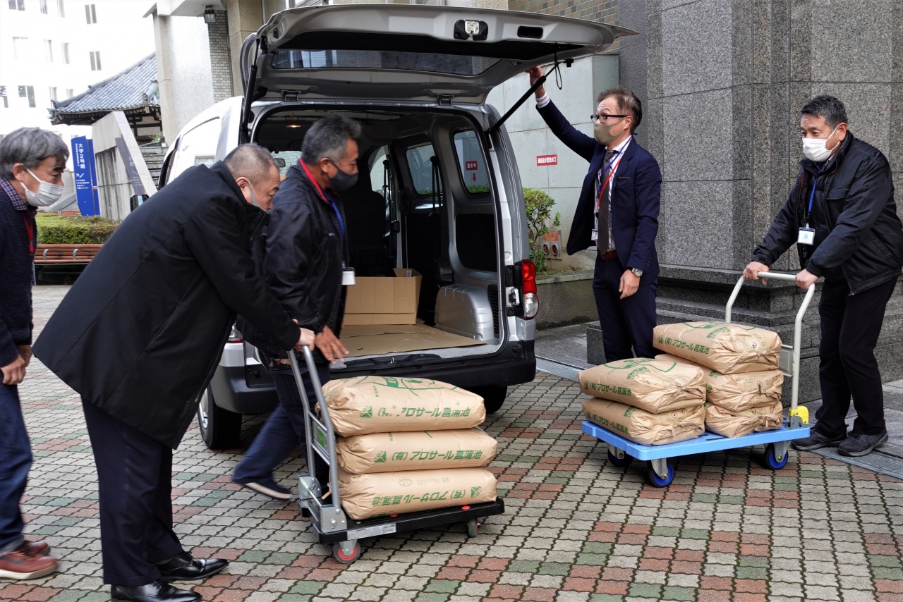 令和3年12月6日(月)に、一般財団法人杉本育文化財団から、学校給食への支援として新米を寄贈していただきました。